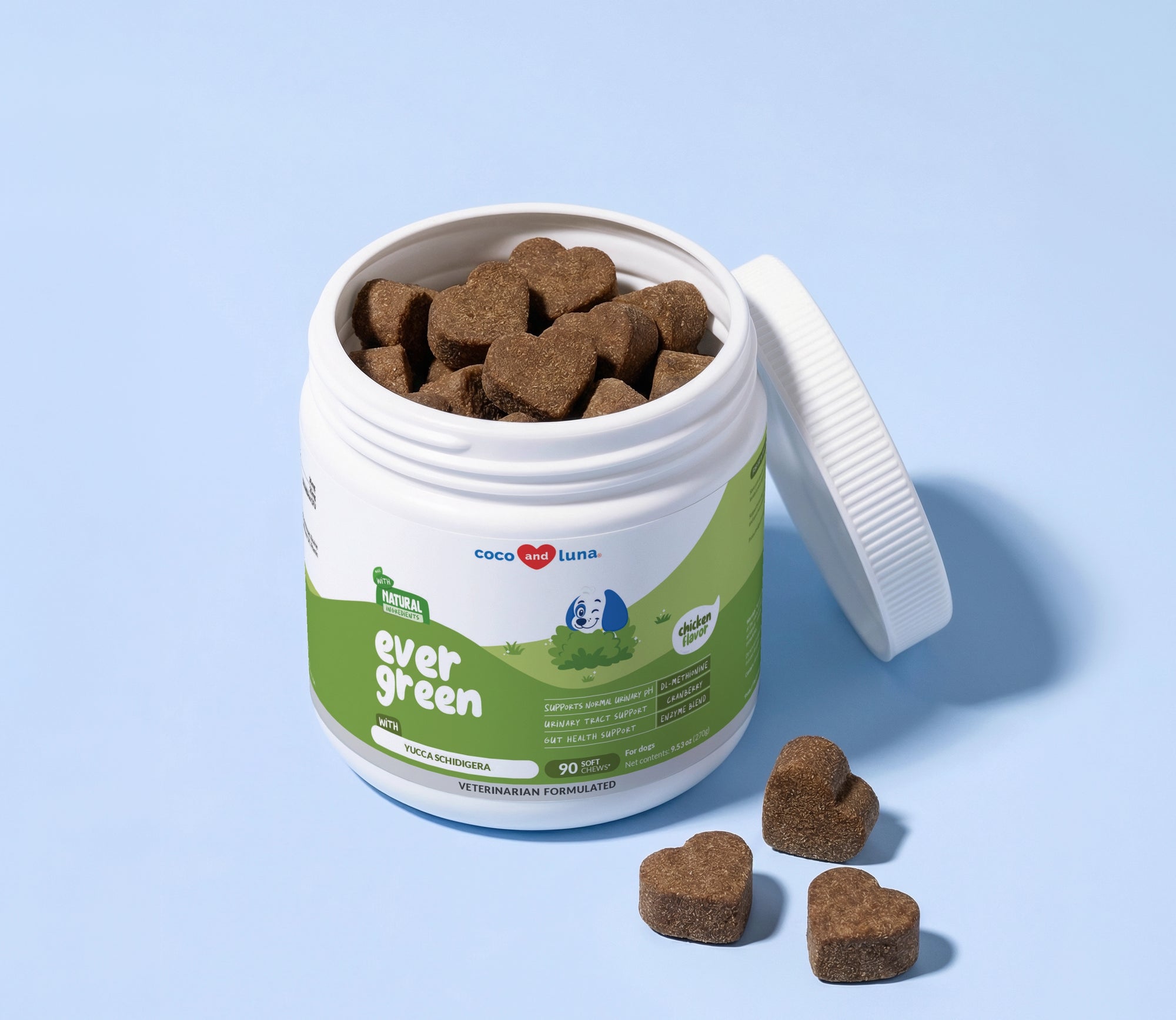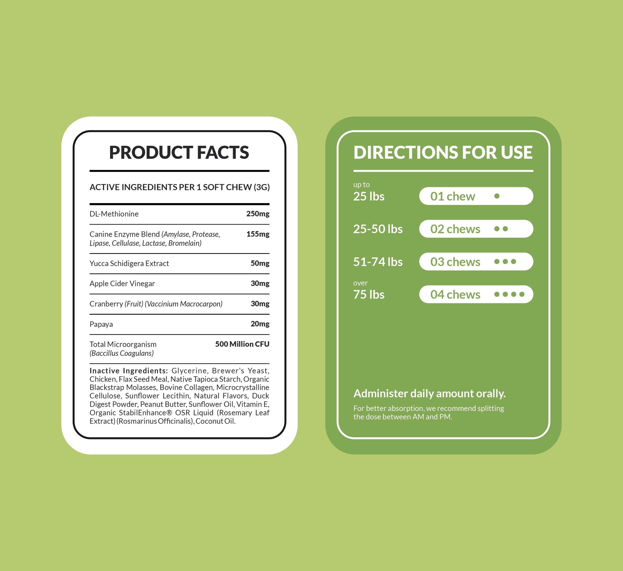 During the first month, your dog starts absorbing DL-Methionine and Apple Cider Vinegar, which begin supporting balanced urinepH.